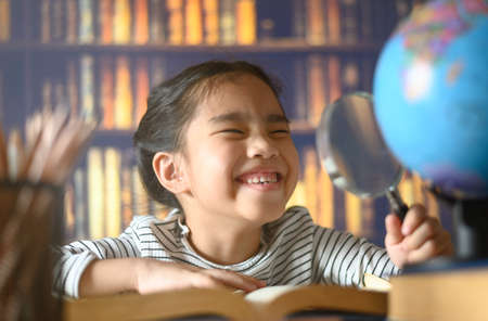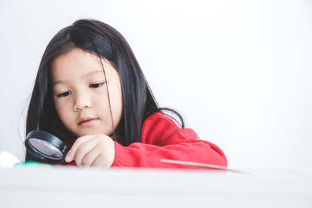 The little girl enjoys studying science. She holds a magnifying glass. Concept of child education development