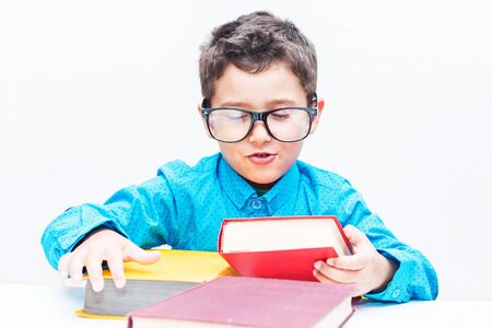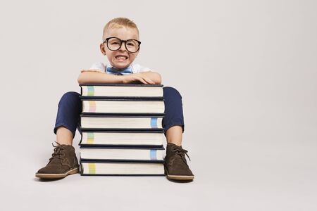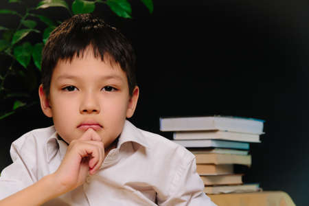Smart boy in glasses sitting between two piles of books and look away thoughtfully.
