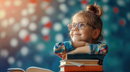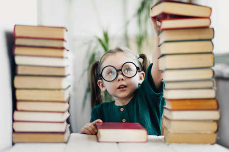 Cute funny little girl in round shaped glasses look up on many books, getting ready for school. Preschool education concept.
