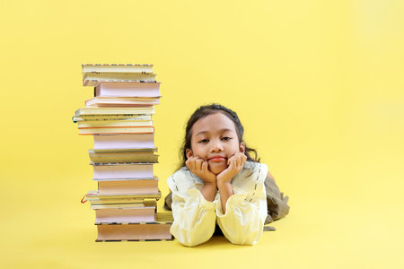 Female Little Kids Posing Beside Stacked Books on Yellow Background. Copy Space for Text