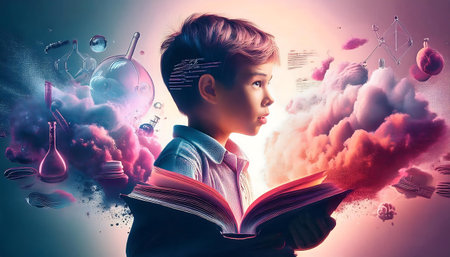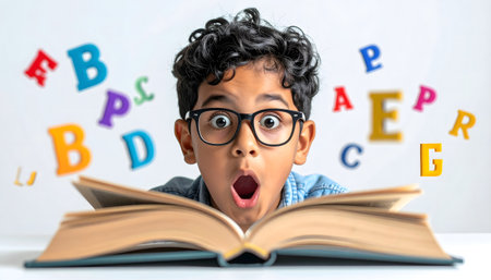 Young boy wearing glasses reading an illuminated book with a magical glow, set in a fantasy-inspired digital art style.
