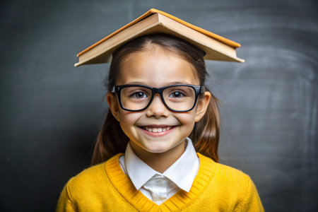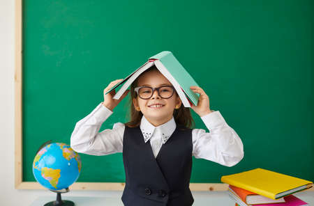 A pretty girl with glasses and books on her head. The child goes to school for the first time. A child in the classroom on the background of a blackboard. Back to school.