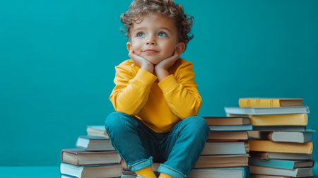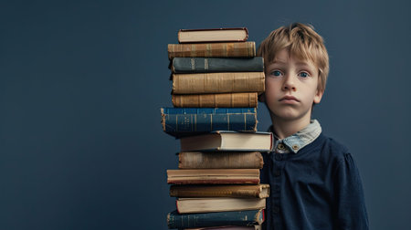 a 4-year-old boy proudly holds a stack of heavy books in his hands against a navy blue background, creating a heartwarming and inspiring image with space for text to convey messages of education