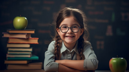 Generative AI : pretty little girl schoolgirl with books and apple in a school board