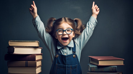 Generative AI : happy little girl schoolgirl with a book from the blackboard