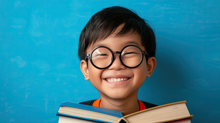 Back to school concept. Young asian boy with dark hair and round glasses happy funny cute little child boy smiling and laugh hug books, studio shot isolated blue background. Kid from preschool kindergarten with school bag education - AI Generated.