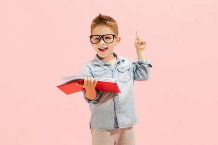Portrait of little boy, child in jeans t-shirt and glasses, posing with book isolated over pink background. Education look. Concept of childhood, family, emotions, lifestyle, fashion, ad