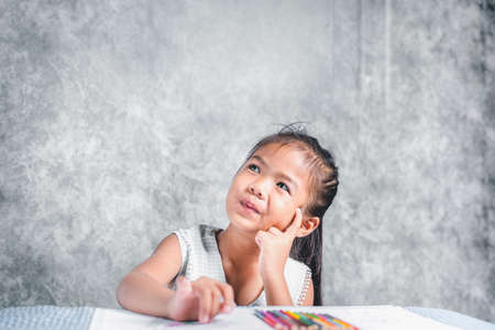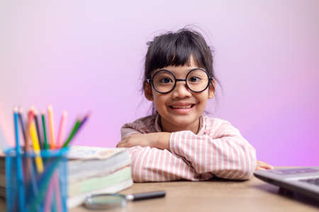 asian child girl industrious is sitting at a desk indoors. Kid is learning in home