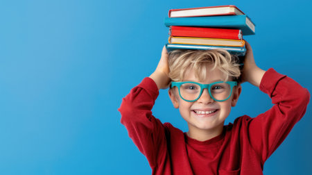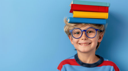 A cheerful young boy balances a colorful stack of books on his head, wearing blue glasses and a joyful expression against a vibrant blue backdrop.