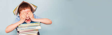 Upset schoolboy sitting with pile of school books and covers his face with hands isolated on a blue background