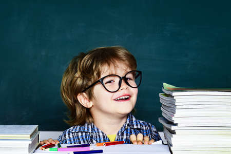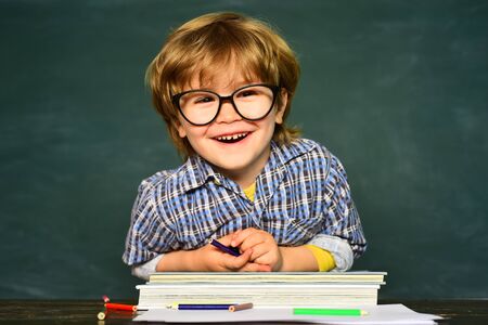 Back to school and happy time. Funny little boy in glasses on blackboard background. Kid with a book.