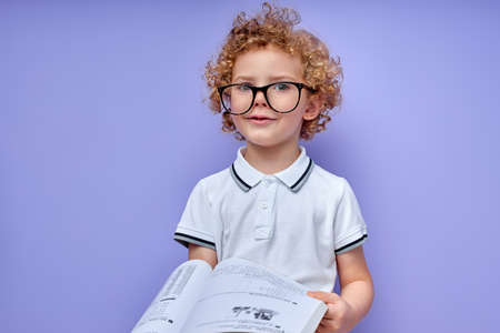 Intelligent shy child boy in spectacles holding book in hands, looking at camera isolated over purple background, cute curly boy in casual wear enjoy studying, education, preparing for school