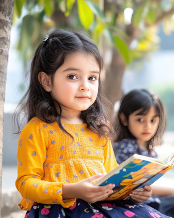 Two children sit engaged in reading vibrant storybooks beneath a lush tree, enjoying a peaceful moment filled with imagination and wonder.