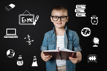 Clever pupil. Calm clever enthusiastic pupil wearing big glasses and smiling cheerfully while holding a beautiful notebook with important information
