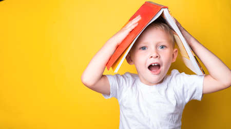 Portrait of funny caucasian blonde school boy with book on his head looking and smiling at camera on yellow background. Back to school and Education concept.