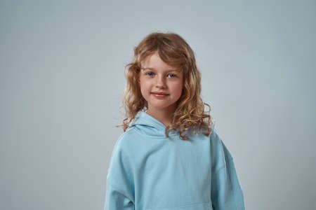 Portrait of a cute little boy in a colorful hoodie. Studio shot.