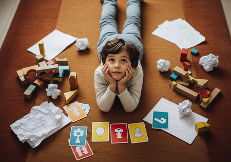 Sad child sitting on the floor in his messy room full of toys, feeling lonely and abandoned