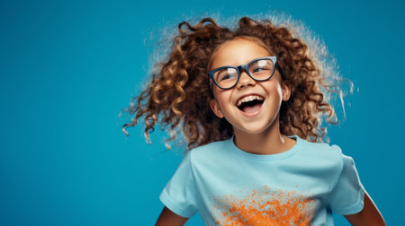 portrait of a happy little girl laughing out loud on a blue background, happy childhood and lifestyle concept, copy space for text