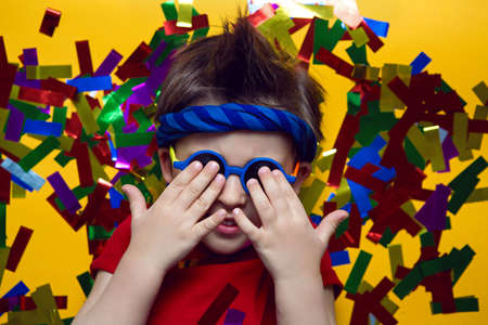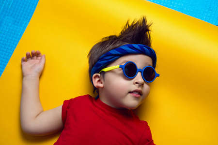 child a boy in a red t shirt and sunglasses is lying on yellow paper resting at home during the epidemic