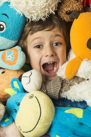 Creative portrait of a boy with his face surrounded by stuffed animals.