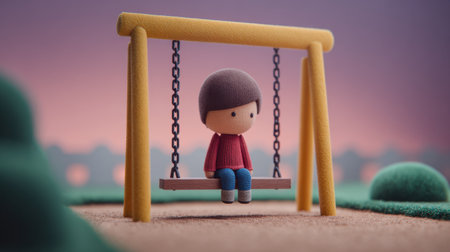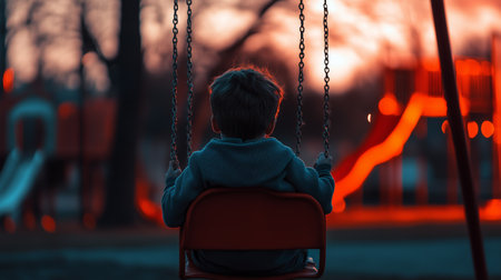 Sad child wearing a beanie and a beige jacket sitting alone on a swing in a deserted playground located in a residential area, conveying a sense of loneliness and abandonment.