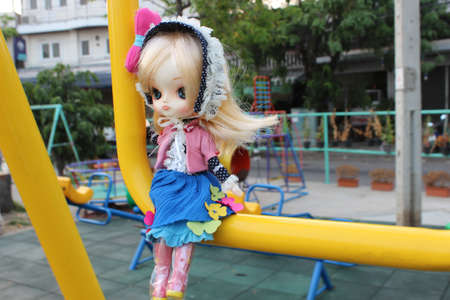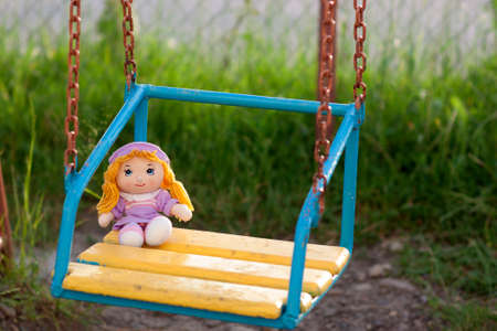 toy doll and teddy bear on a children's swing in the playground