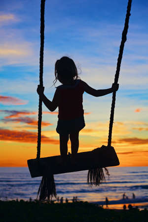 Black silhouette of baby girl flying high with fun on rope swing on blue orange sunset sky background. Travel lifestyle, people beach activity on summer family vacation with child in tropical island.