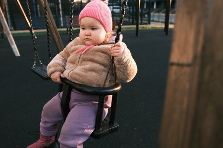 Child is having fun swinging in a park while wearing a pink hat and cozy outfit The bright morning light adds a cheerful atmosphere to the playful moment.