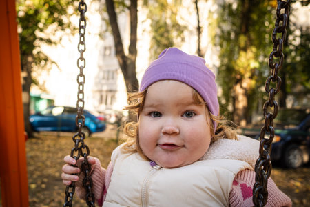 A joyful toddler swings in the park, wearing a purple hat and a cozy vest. Bright autumn leaves create a warm atmosphere, while laughter fills the air.