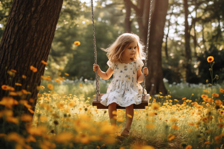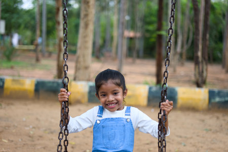 A young girl beams with joy as she soars through the air on a park swing, capturing the pure bliss of childhood.
