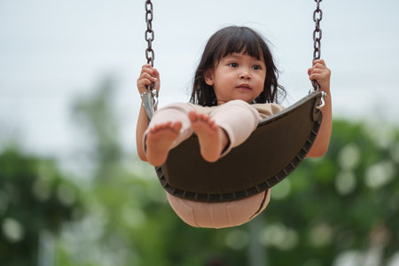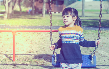 Child asian girl having fun to play swing in playground
