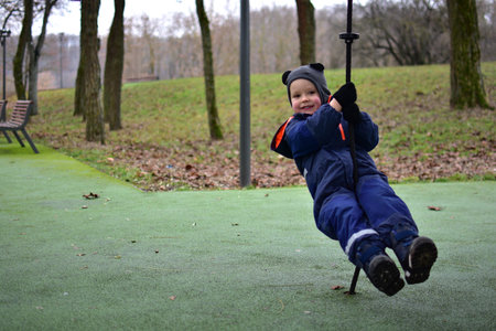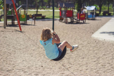 child having fun on a swing on the playground in public park.