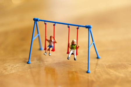 Plaster dolls of happiness children sitting on swing.