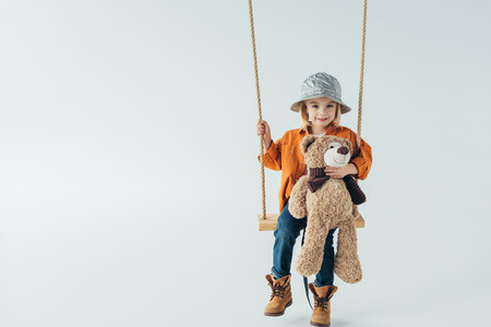 cute kid in jeans and orange shirt sitting on swing and holding teddy bear