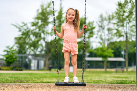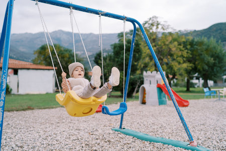 cheerful toddler girl playing on a swing at outdoor playground