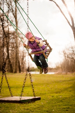 Cute little child swinging outdoor in nature - early spring time
