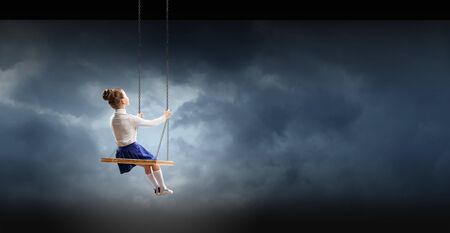 Craziness and freedom. Young summer girl playing on swing-set outdoor. Crazy playful child swinging very high to touch the sky.