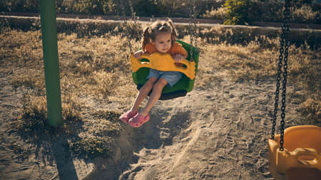 A little cheerful girl plays on vacation in the park on a children's playground. Happy child has fun on a swing in the park. Fun holidays