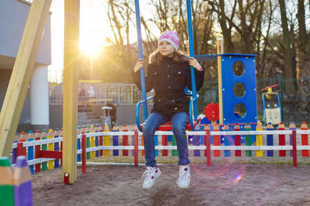 Girl child 8, 9 years old on swing, childrens playground. Spring season, girl in jacket and hat