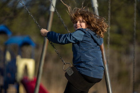 Child playing on a swing. Active kid swinging at the playground. Child swinging in the park. Happy boy enjoying outdoor play. Cute child having fun on playground. Teen swinging on playground.
