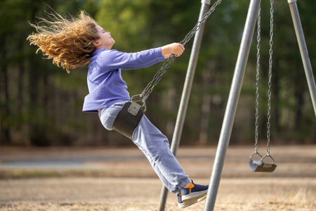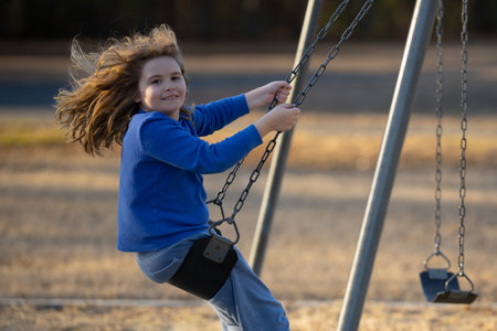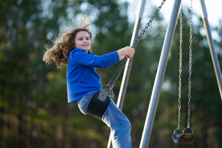 Child enjoying a fun ride on swing. Happy kid on playground. Carefree kid swinging outdoors. Happy children play outside. Blonde kid swinging with excitement. Playful kid outdoor. Fun kids face.