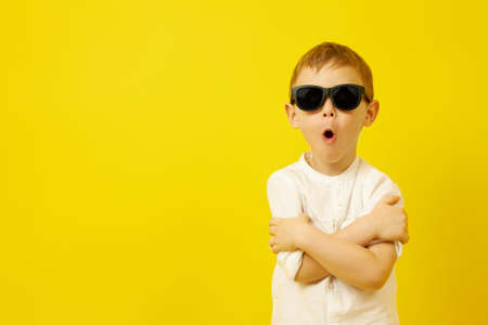 A boy in black sunglasses with his arms crossed and his mouth open funny poses on a yellow background