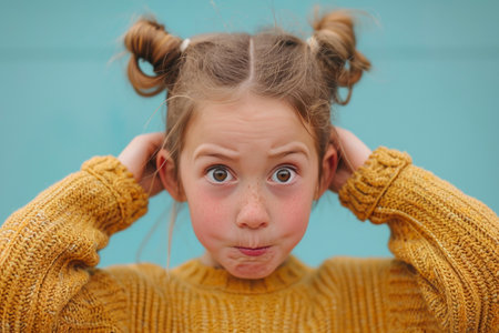 A young girl with two curly pigtails displays a shocked expression while wearing a polka dot shirt. The vivid yellow backdrop enhances her emotional response, capturing a moment of surprise.