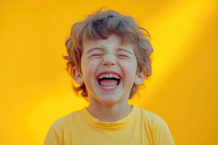A young boy with curly hair joyfully opens his mouth wide, highlighting his excitement against a bright yellow backdrop.