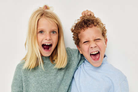 Two children boy and girl fooling around having fun together. Happy childhood concept.