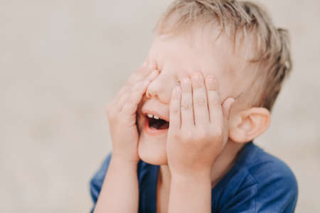 Close up portrait cute smiling blue eyed freckled blond boy artistic facial expressions, gestures funny mischievous in happy mood. Childhood, children education psychology behaviour problems concept