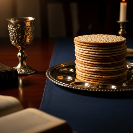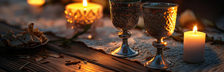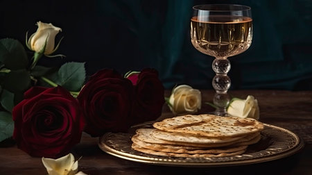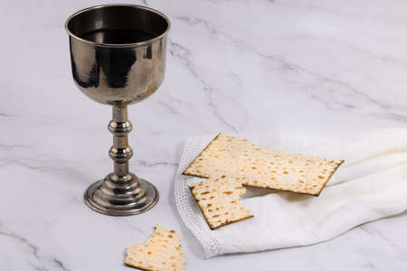 Pesach Jewish traditional celebration with cup wine kosher matzah on passover holiday