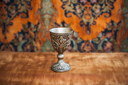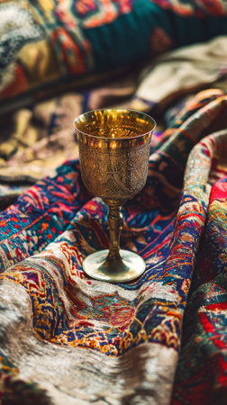 Intricately Detailed Golden Goblet on Colorful Textile. Concept of Cultural Heritage, Persian Art. Purim. Vertical.