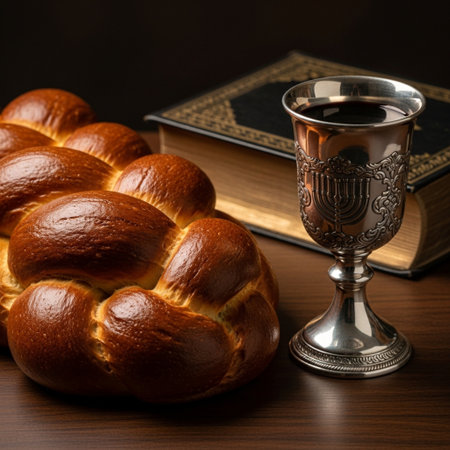 Shabbat Shalom challah bread, shabbat wine and candles on wooden table. Side view. Copy space.