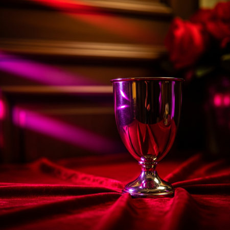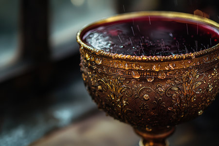 Close view of a decorative chalice filled with red wine, condensation forming on the rim in warm light.
